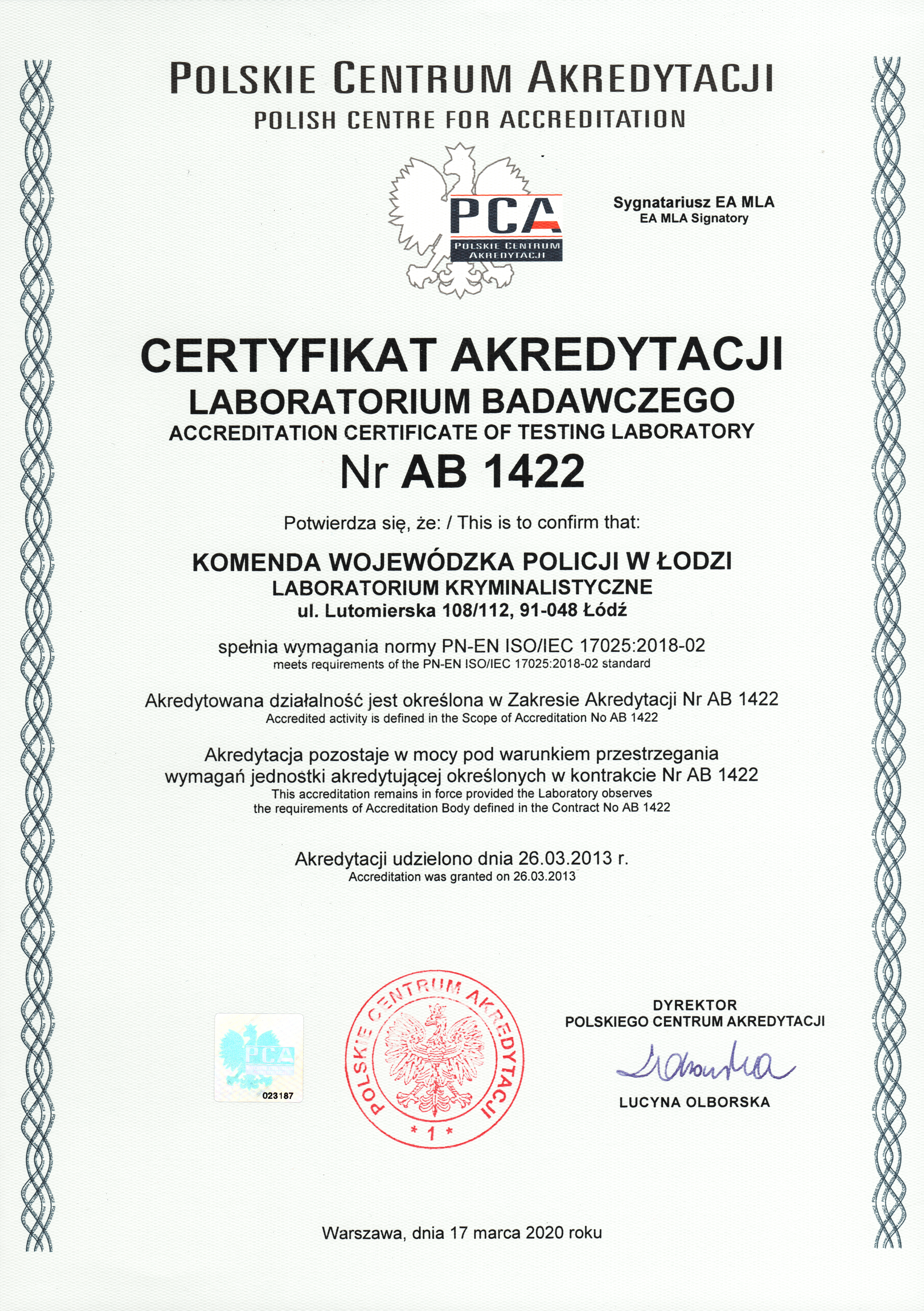 Laboratorium Kryminalistyczne KWP w Łodzi posiada akredytację nr AB 1422 od dnia 26.03.2013 r.